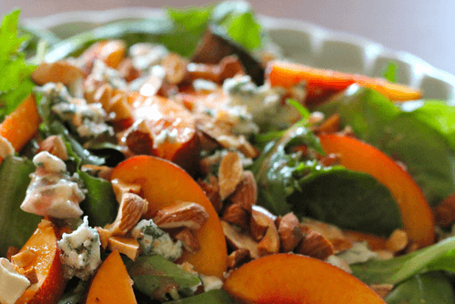 Нектарины нарежьте на дольки, избавьтесь от косточки. Нарежьте сыр и миндаль. Высыпьте листья салата, добавьте сыр, нектарины и миндаль, сверху полейте заправкой.