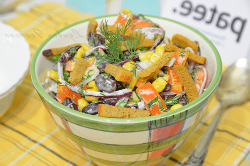 Салат из красной фасоли с кукурузой — это яркое и питательное блюдо европейской кухни, которое сочетает в себе нежную текстуру фасоли, сладость кукурузы и свежесть зелени. Его происхождение можно связать с традицией простых, но сытных салатов, которые готовятся быстро и наполняют энергией. Ароматный чесночный соус с лимоном и майонезом придает блюду пикантность, а ржаные сухарики добавляют хрустящую текстуру. Такой салат подходит как самостоятельное блюдо или как дополнение к основному приему пищи. Он особенно хорош в летний сезон, когда хочется легкости и свежести. Его можно подавать к мясным или овощным блюдам, а также использовать как закуску на праздничном столе.