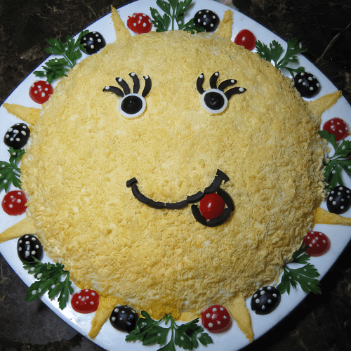Уложить слоями, каждый слой смазывая майонезом.