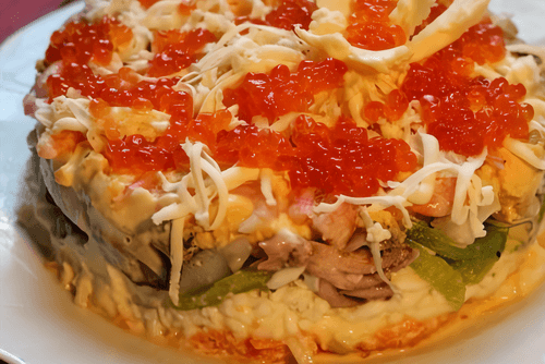 Слоеный морской салат с киви — это утонченное сочетание морепродуктов и освежающей кислинки фрукта, создающее гармонию вкусов и текстур. Родом из современной европейской кухни, он удивляет нетипичным ингредиентом — киви, который придает нежным креветкам и морскому коктейлю приятную свежесть. Этот салат собирается слоями, где каждый ингредиент раскрывает свой характер: мягкость яиц, пикантность зеленого лука, насыщенность моркови и сливочность майонеза. Важной особенностью является его предварительное настаивание в холодильнике, благодаря чему слои пропитываются ароматами и салат приобретает сбалансированный вкус. Перед подачей он переворачивается, превращаясь в элегантное угощение, украшенное красной икрой и сливочным маслом. Такой салат станет идеальным выбором для праздничного стола, поражая гостей необычным сочетанием морской свежести и фруктовой экзотики.