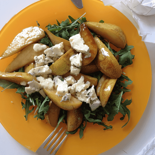 Выложить на тарелку рукколу, затем грушу, покрошить горгонзолу (можно взять и другой сыр с плесенью), посыпать орешками и приправить оставшейся карамелью.