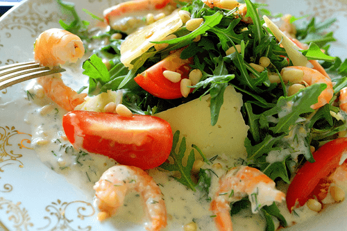 Теплый салат с креветками под соусом дор-блю