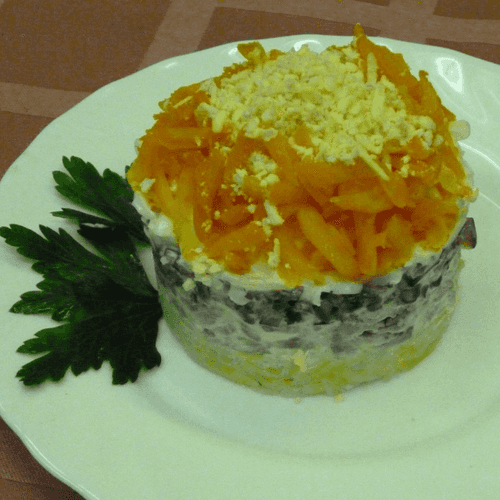 Утиную грудку и соленые грибы нарезать тонкой соломкой, овощи натереть на крупной терке, яйцо на мелкой терке. Все укладывать в последовательности — картофель, грудка, грибы, яйцо , морковь. каждый слой промазать майонезом.