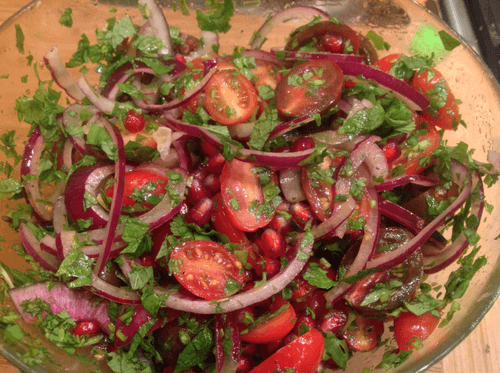 Смешайте помидоры, лук, зерна граната и травы в прозрачном салатнике.