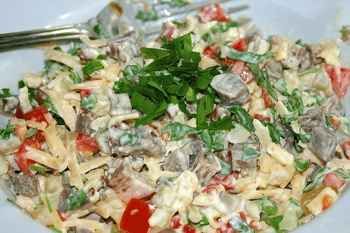 Все ингредиенты нарезать кубиками и выкладывать слоями: говядину, картофель, соль, перец, майонез, огурцы, сыр, майонез, помидоры, соль, перец, майонез, немного сыра и рубленная петрушка.
