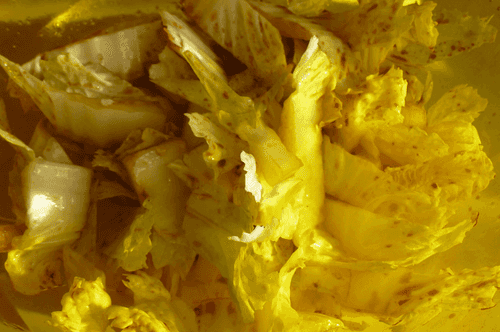 Пекинскую капусту нарезать средними или более крупными кубиками, как вам больше нравится. Добавить адыгейской соли по вкусу.