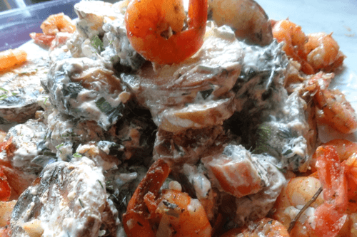 Салат из запеченных овощей с креветками и заправкой крем-фреш