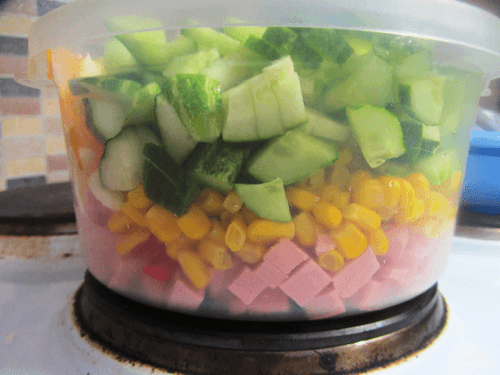 Сварить яйца вкрутую, помыть болгарский перец и огурец в холодной воде, слить воду из кукурузы.