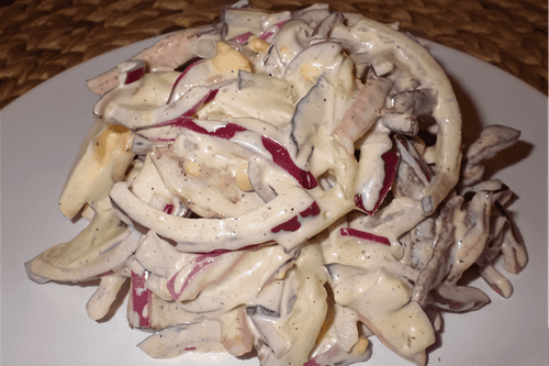 Майонез можно приготовить самому или готовый развести сметаной пополам. Заправить и можно угощаться.