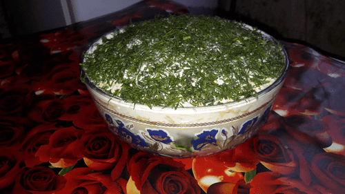 Копченую курицу разобрать на волокна, уложить на дно блюда.