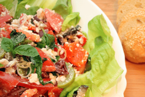 Салат романо порвать руками, помидоры нарезать тонкими дольками, лук-порей — кольцами, маслины можно добавить целиком или нарезать кружочками. Базилик порубить, но не очень мелко, оставить несколько листиков для украшения.
