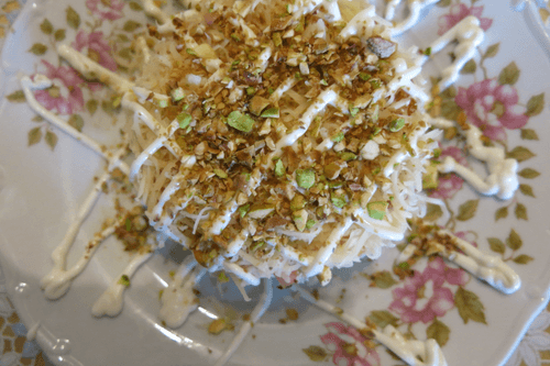 Фисташки пожарить и измельчить ножом.