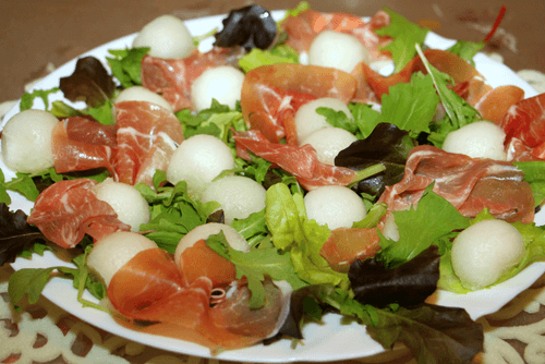 Выложить на большое блюдо салатные листья, сверху шарики дыни и тонко нарезанную ветчину. Полить заправкой.