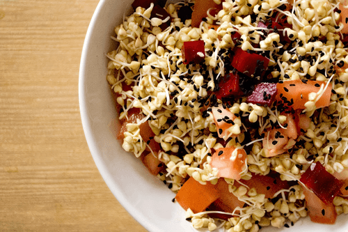 Помидоры и свеклу (варенную или сырую) нарезать кубиками, смешать с проростками гречки, добавить специи и прочее по вкусу. Можно посыпать черным тмином.