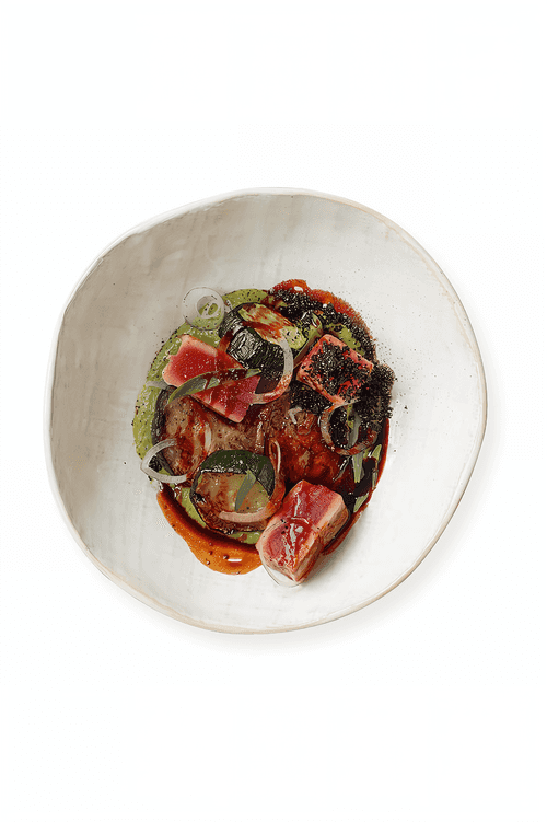 Салат с тунцом и цукини — это легкое и изысканное блюдо американской кухни, сочетающее в себе свежесть овощей и насыщенность морепродуктов. Его основа — нежный тунец, обжаренный до золотистой корочки, и цукини с баклажанами, пропитанные ароматами гриля. Соус из брокколи придаёт мягкость и легкую кремовость, а терпкость маслин добавляет выразительность вкусу. Земля из маслин — необычное украшение, создающее тонкий контраст текстур. Сливки делают соус более бархатистым, а терияки привносит изысканную сладковато-соленую ноту. Этот салат подходит как для повседневного ужина, так и для торжественного ужина, удивляя своей гастрономической гармонией.