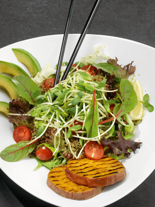 Разложить по тарелкам салатные листья (лоло-росса, латук, корн, руккола, мангольд). Сверху — теплое киноа (в жаркую погоду — холодное). Затем — помидоры (разрезанные пополам) и ростки подсолнечника.