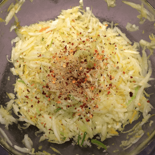 Фенхель натрите на крупной терке или сделайте тоже самое с помощью кухонного комбайна.