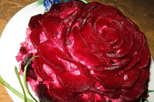 Свеклу тонко нарезать на кружочки. Воткнуть по кругу, начиная сверху.
