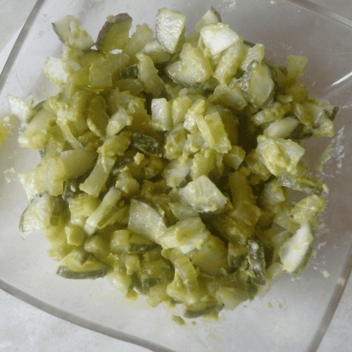 Нарезать кубиками огурец и стебли сельдерея, в равном объеме.