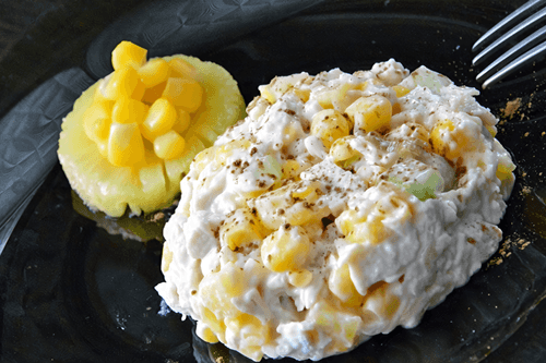 Далее в глубокой посуде смешиваем куриное филе, ананасы, рис, сельдерей, кукурузу, сыр и добавляем корицу.
