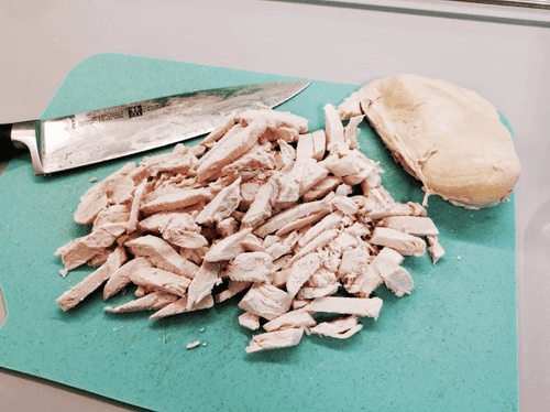 Куриное филе отварить. Затем нарезать небольшими кубиками или соломкой.