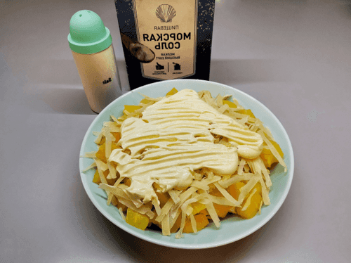Заправить салат майонезом. По вкусу немного посолить.