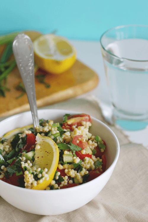 Смешать петрушку, лук, помидоры и кускус. Заправить салат 4–5 столовыми ложками оливкового масла и выжать сок половины лимона. Посолить, поперчить и отправить в холодильник, чтобы салат пропитался. Можно добавить дольки лимона как для декора, так и для вкуса.