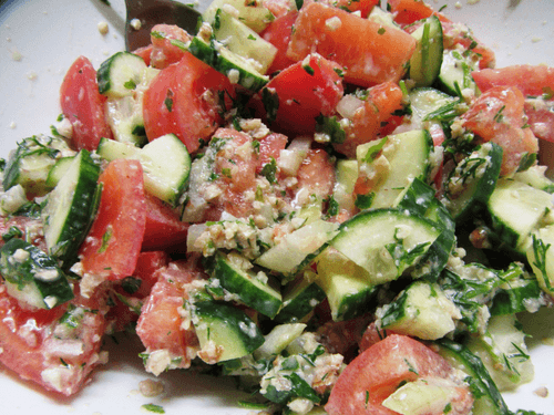 Салат из помидоров и огурцов с ореховым соусом – это яркий пример того, как простые ингредиенты могут создать богатый и насыщенный вкус. Это блюдо берет свое начало из русской кухни, но его ореховый соус намекает на грузинские кулинарные традиции. Сладость помидоров, свежесть огурцов и пикантность орехового соуса создают гармоничное сочетание, которое пленяет вкусом. Ароматные травы – кинза, петрушка и укроп – добавляют нотку свежести, а специи подчеркивают насыщенность вкуса. Такой салат прекрасно подходит как самостоятельное блюдо или как дополнение к мясным и рыбным угощениям. Он идеально сочетается с легкими белыми винами и прекрасно освежает в теплое время года, делая каждую трапезу по-настоящему запоминающейся.