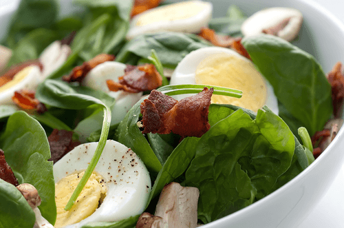 Перед подачей заправить охлажденным соусом, нежно перемешать. Украсить жаренным беконом, яйцом и грибами (по желанию).