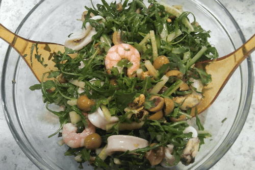 Смешать огурцы, морепродукты, оливки и рукколу. Посолить, поперчить.