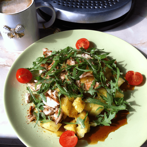 Все выложить на тарелку, засыпать рукколой.