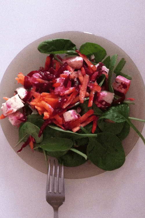 Морковно-свекольный салат с адыгейским сыром и грецким орехом
