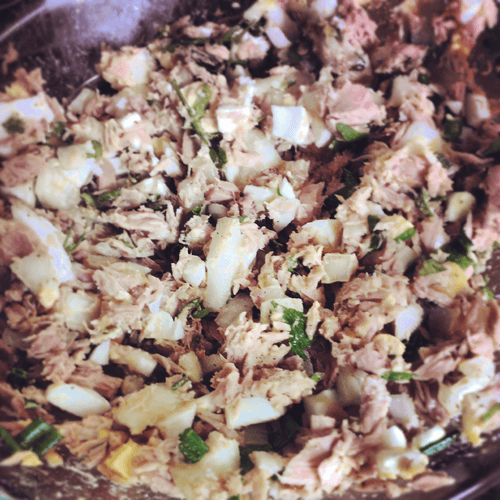 Нарезать кубиками лук, яйца, слить сок из тунца, добавить к остальным ингредиентам.