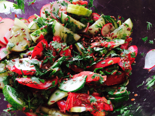 Летний салат с льняным маслом – это настоящий праздник свежести и легкости. Этот рецепт имеет корни в армянской кухне, где ценится естественный вкус продуктов и польза для здоровья. Салат сочетает в себе хрустящие огурцы, сочные помидоры, пикантный редис и ароматную зелень, создавая гармонию текстур и оттенков вкуса. Заправка из льняного и подсолнечного масел придает блюду нежный ореховый привкус, а семена льна добавляют легкую хрусткость и питательную ценность. Летний салат идеально подходит для жарких дней, когда хочется чего-то освежающего и полезного. Его можно подавать как самостоятельное блюдо или как гарнир к мясу и рыбе, добавляя нотку свежести к любому столу.