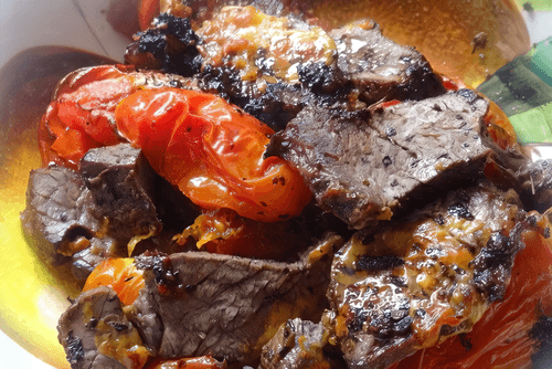 Отварную телятину или говядину, оставшуюся от ростбифа, стейка, нарезать небольшими кусочками и в середине запекания уложить к помидорам.