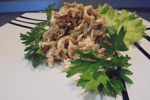 Куриную грудку разбираем на волокна. Добавляем в салатницу.