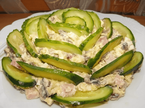 Салат с ветчиной, грибами и огурцами