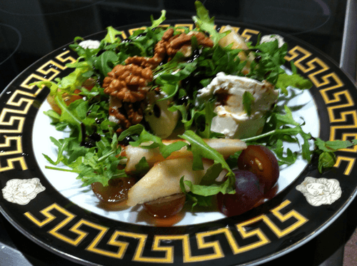 Полить салат маслом и бальзамическим кремом (рисуя полосочки).