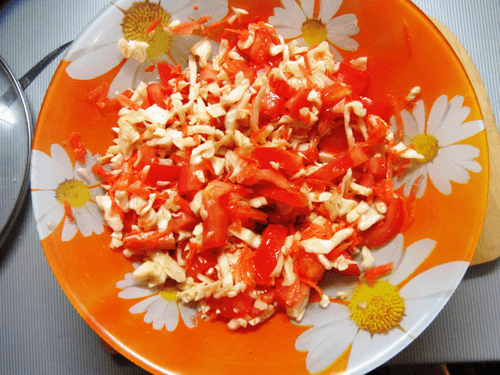 Этот яркий и свежий салат-гарнир — идеальное дополнение к жареному мясу, придавая блюду сочность и легкость. Его корни уходят в европейскую кухню, где простота и баланс вкусов ценятся превыше всего. Капуста придает хрусткость, морковь добавляет сладость, а помидоры привносят сочную кислинку. Легкая пряность репчатого лука гармонично сочетается с ароматной зеленью. Заправка из растительного масла, яблочного уксуса, соли, перца и щепотки сахара объединяет все компоненты, делая салат нежным и насыщенным. Этот салат подчеркивает вкус мясных блюд, освежая их и облегчая восприятие. Он идеально подходит как к сочным стейкам, так и к запеченной птице, создавая гармонию вкусов в каждом кусочке.