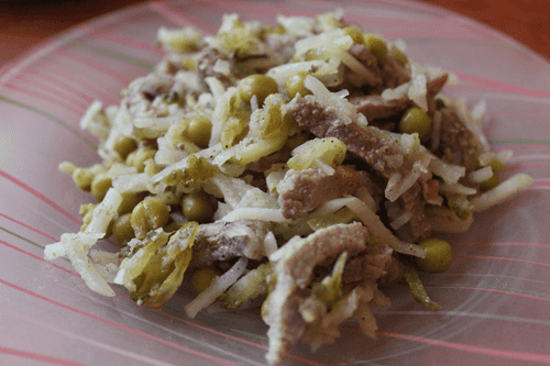 Очищенный картофель натереть на терке для корейской моркови, чтобы получилась мелкая соломка. Промыть 3–4 раза от крахмала. Картофель высыпать в кипящую воду, довести до кипения и проварить 2–3 минуты на сильном огне. Затем, промыть в дуршлаге под холодной водой. (Картофель получается слегка недоваренный) Смешать мясо с картофелем. Добавить молотый перец.