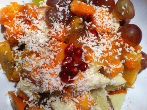 Зимний фруктовый салат с медом и кокосом — это изысканное сочетание свежих и сладких плодов, которое дарит вкус солнечного лета даже в холодные месяцы. Исторически фруктовые салаты популярны в европейской кухне благодаря их легкости и богатству витаминов. В этом варианте соединяются гранат, папайя, яблоки, бананы, инжир, финики, виноград и хурма, создавая игру текстур и ароматов. Натуральная сладость фруктов усиливается медом, а кокосовая стружка придает блюду воздушную нежность. Этот салат идеален как утренний заряд бодрости или легкий десерт, наполняющий день нотами тропического наслаждения. Он прекрасно сочетается с йогуртом или орехами, превращаясь в настоящее гастрономическое удовольствие.