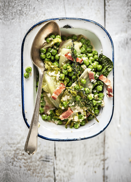 Тушеный салат романо с копченым беконом и зеленым горошком