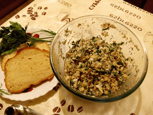 Готовый салат можно выкладывать на тонкие кусочки белого хлеба, получая, тем самым, отличную закуску.