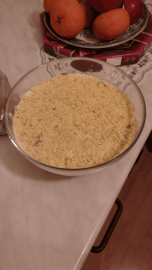 Горбушу размять и выложить в салатницу, промазать майонезом. Это будет первый слой.