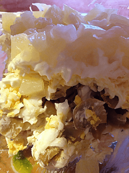 Последний слой — ананасы. Сливаем их в дуршлаг, мелко режем и выкладываем на салат сверху.