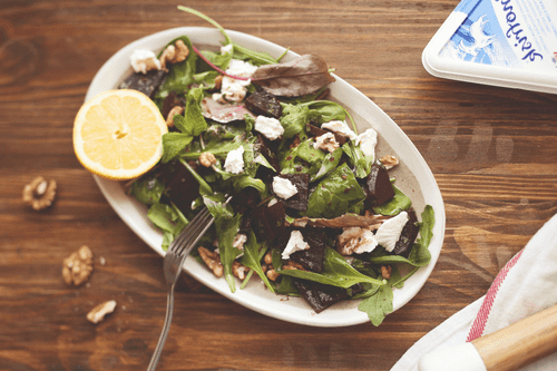 Выложите в тарелки салатный микс, распределите по тарелке козий сыр, дольки маринованной свеклы и грецкий орех. Заправьте салат оставшимся маринадом.