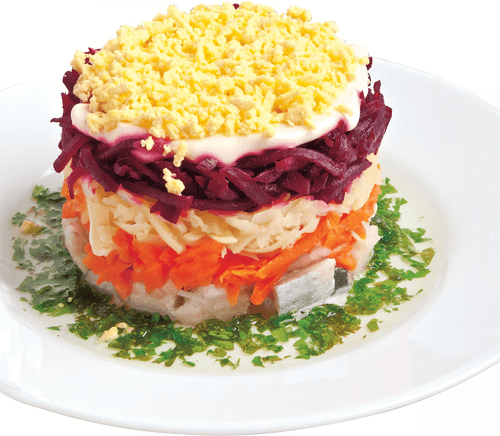 Сельдь под шубой – это одно из самых знаковых блюд русской кухни, символ праздничного застолья и уютных семейных вечеров. Это слоёный салат, в котором нежная солёная сельдь сочетается с мягкостью варёного картофеля, сладостью моркови и свеклы, пикантностью лука и кремовой текстурой майонеза. Вкус блюда удивительно гармоничен – солёное, сладкое и сливочное переплетаются в едином ансамбле. Традиционно «шуба» готовится к Новому году и зимним праздникам, но её любят и в повседневном меню. Благодаря своему насыщенному вкусу и питательности, этот салат прекрасно сочетается с ржаным хлебом и холодными закусками, создавая теплую атмосферу. История «Сельди под шубой» уходит в советские времена, когда оно стало популярным в ресторанах и на домашних столах, став настоящей классикой русской гастрономии.