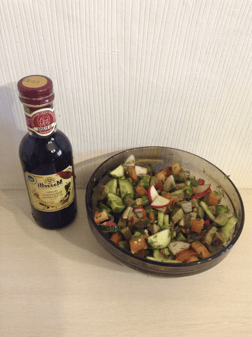 Посолить, поперчить. Добавить бальзамический уксус из модена.
