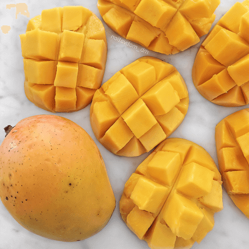 Порезать на кубики манго. (Тут самая хитрая часть дела. Во-первых, фрукт должен быть спелый. Для этого манго а магазине можно слегка сжать, если фрукт будет средней степени упругости и ароматный, значит, он спелый. Резать манго довольно просто. Не очищая от кожуры, держа кусок мякотью вверх, ножом начертить на мякоти решетку. Слегка вывернуть кусок наизнанку и срезать кубики мякоти).