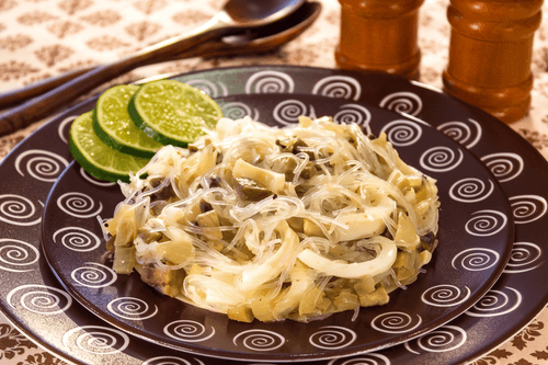 Салат из фунчозы с кальмарами и белыми грибами — это изысканное сочетание морских и лесных ароматов, дополненное нежной текстурой лапши. Его история связана с экспериментами европейских кулинаров, стремившихся соединить азиатскую фунчозу с классическими ингредиентами высокой кухни. Вкус салата многогранен: кальмары придают ему нежность, белые грибы — глубину и насыщенность, а сливочная заправка гармонично объединяет все элементы, добавляя нежные сливочные ноты. Освежающая кислинка лимонного сока и винного уксуса придаёт пикантность, делая блюдо сбалансированным. Этот салат идеален как для праздничного ужина, так и для лёгкого, но питательного перекуса. Он прекрасно сочетается с белыми сухими винами и станет украшением любого стола.